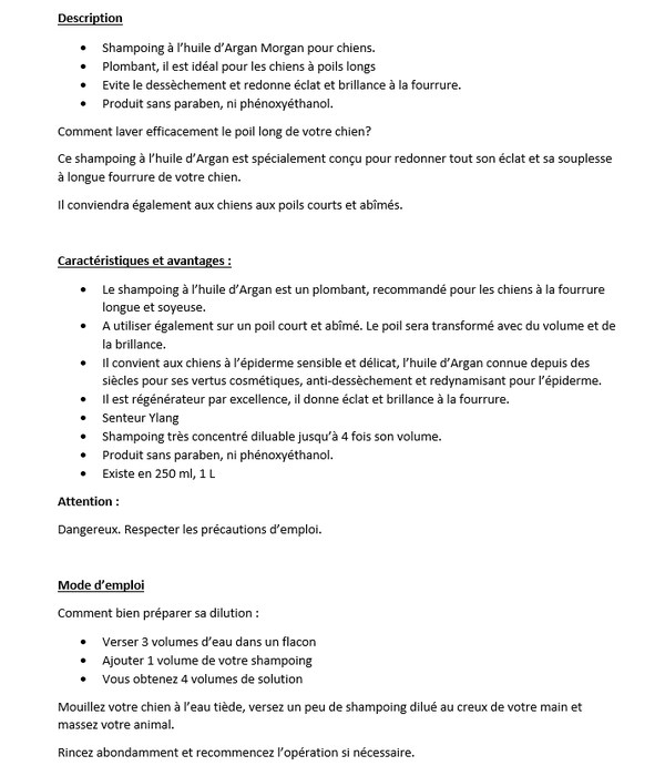 Shampoing avec une base lavante douce qui respecte l'épiderme du chien. L'huile d'Argan régénératrice par excellence, redonne éclat et brillance à la fourrure et évite le dessèchement.