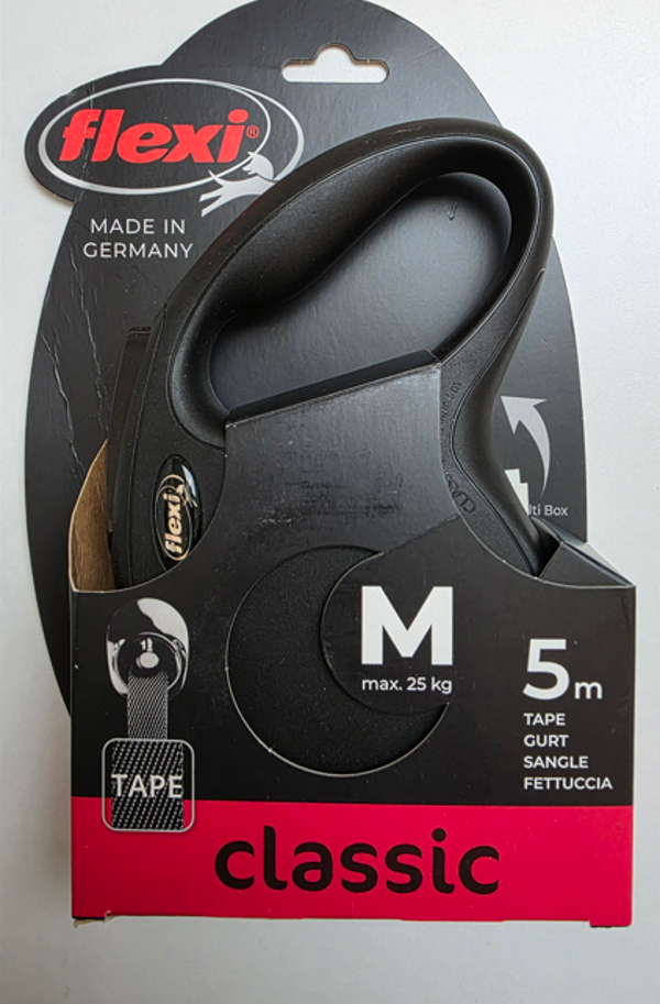 Laisse à enrouleur de la marque Flexi, de couleur noire, avec nouveau système de freinage et nouvelle forme ergonomique.